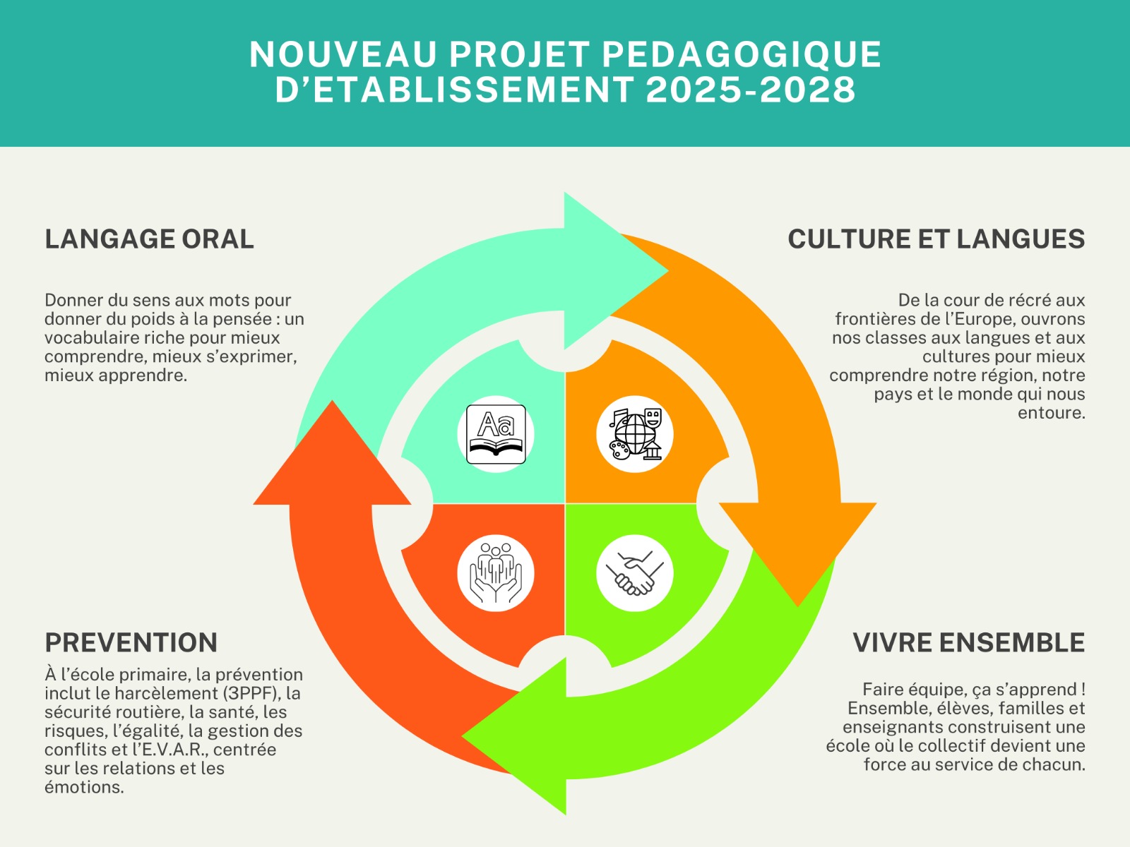 Pour les années 2025-2028, le projet pédagogique de l’école se parcourt en 3 axes d’apprentissage et 1 axe de vivre ensemble.